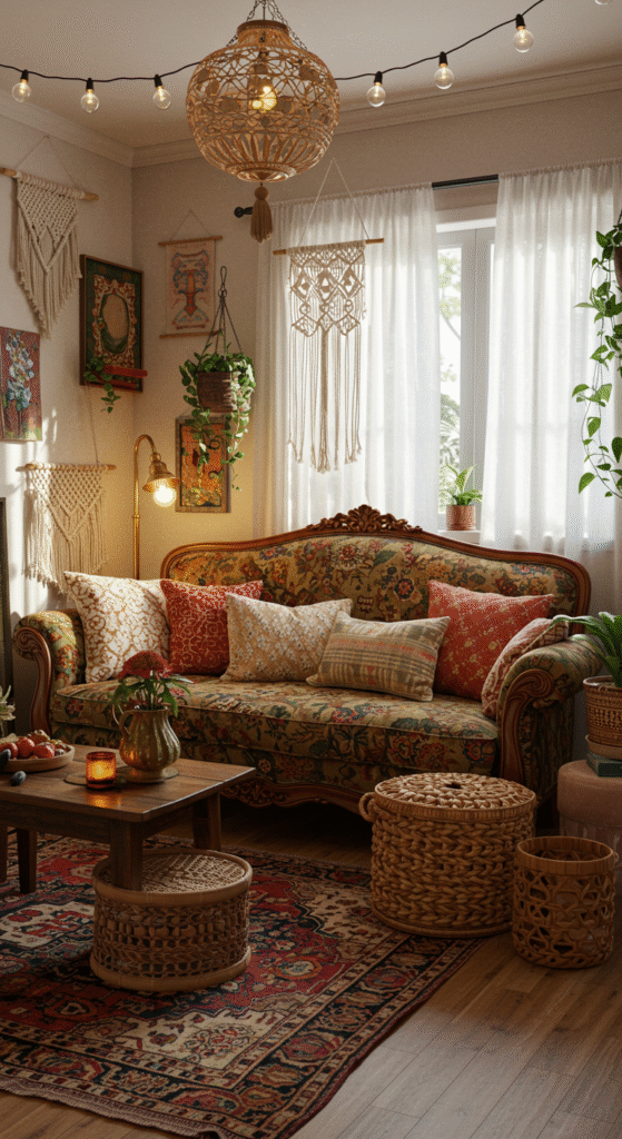 The boho living room aesthetic thrives on creativity and free-spirited design. Bold colors, layered textures, and eclectic patterns define the style. Rattan furniture, woven rugs, and vintage finds add charm. Plants and candles enhance the natural, cozy vibe. Bohemian decor celebrates imperfection, making spaces feel authentic. A boho aesthetic living room feels warm, playful, and full of personality.