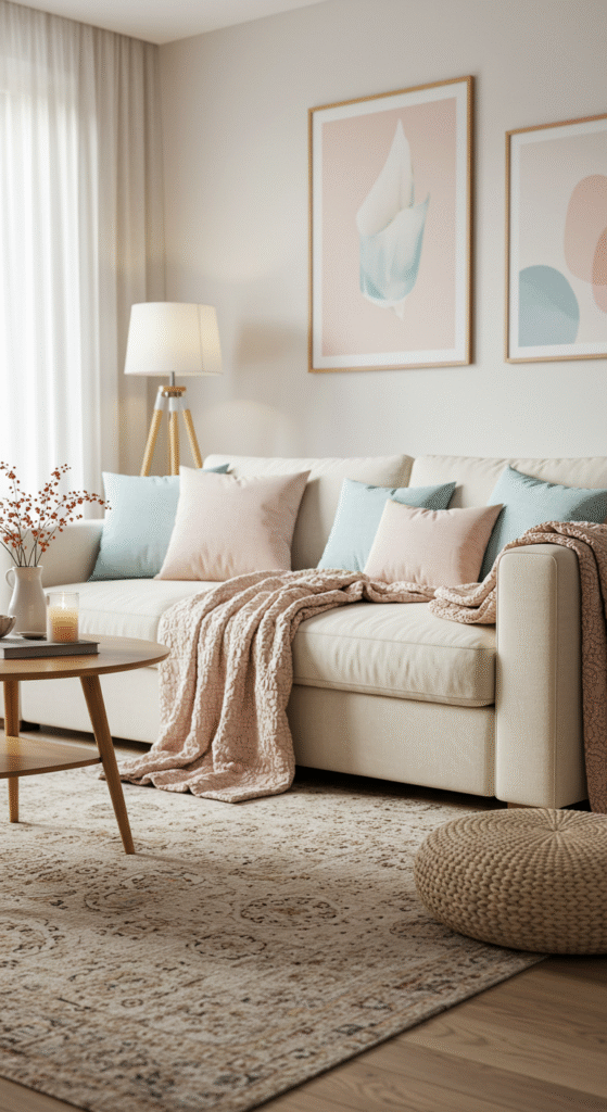Adding soft textures instantly transforms a living room into a cozy retreat. Plush rugs, throw blankets, and cushions create warmth and depth. Layering fabrics adds visual interest while keeping the atmosphere inviting. Warm lighting, like table lamps or candles, enhances coziness. This aesthetic approach works especially well in colder seasons. A living room with soft furnishings feels welcoming and intimate.