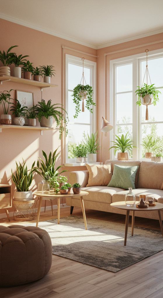 Plants are a must-have for an aesthetic living room, adding life and freshness. A tall fiddle-leaf fig or a cluster of succulents can elevate the design. Plants improve air quality while softening harsh lines in decor. Hanging planters or shelves filled with greenery create visual interest. They work across multiple design styles, from boho to modern. Indoor plants instantly make living rooms feel alive and balanced.