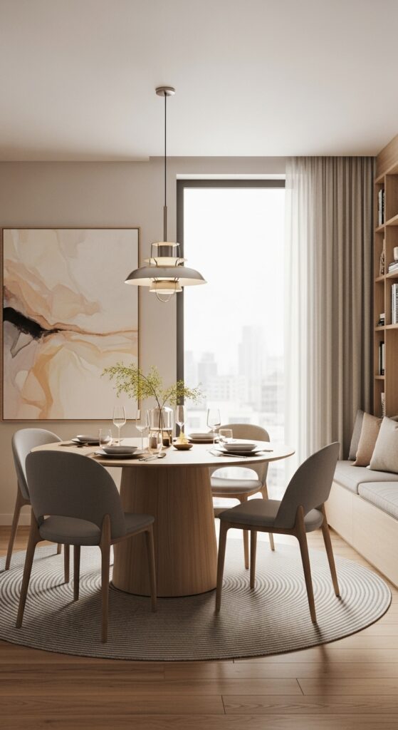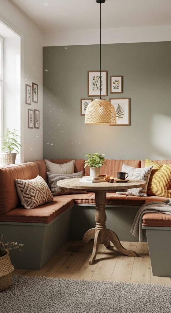 A corner nook can transform unused space into a charming dining spot. Use a small round table with a built-in bench or cushioned seating against the wall to save floor space. Add soft pillows, a pendant light, and maybe a small plant for a warm, inviting look. This setup works especially well near a window where natural light enhances the cozy atmosphere.