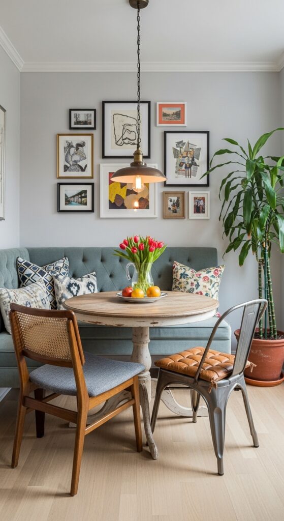 Gone are the days when every chair had to match perfectly. Mixing different chair styles or adding a bench on one side gives your dining area a unique, curated vibe. Try blending wood and metal finishes or using different colors within the same palette. This eclectic approach adds warmth and personality to small spaces.