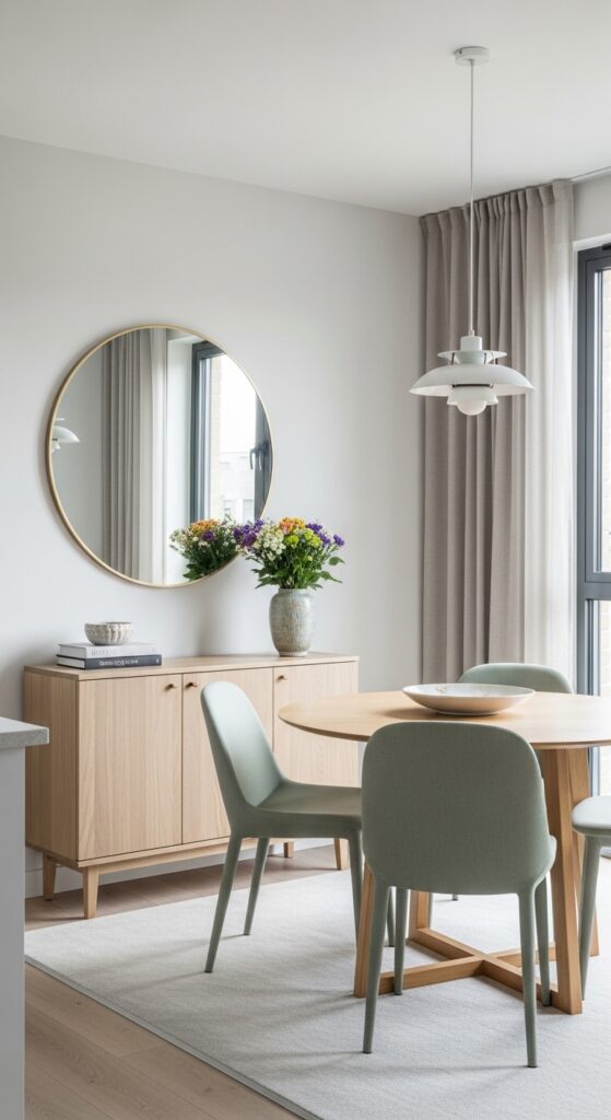 A mirror placed behind or beside your dining table instantly makes the area look bigger and brighter. It reflects natural and artificial light, creating an illusion of more space. Decorative mirrors also serve as stunning wall features, adding depth and elegance. Choose a frame that complements your overall apartment decor for a cohesive look.