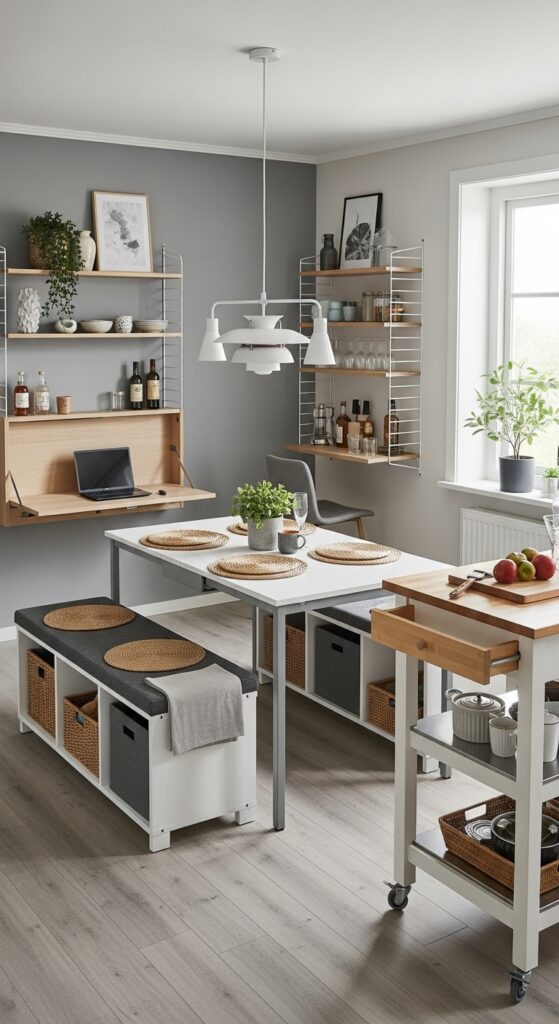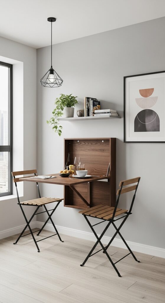 If your apartment is extra compact, consider wall-mounted drop-leaf tables or foldable dining sets. They can be tucked away when not in use, freeing up valuable floor space. Pair them with slim, stackable chairs for a flexible setup. This smart, space-saving idea is perfect for city apartments or studio living.