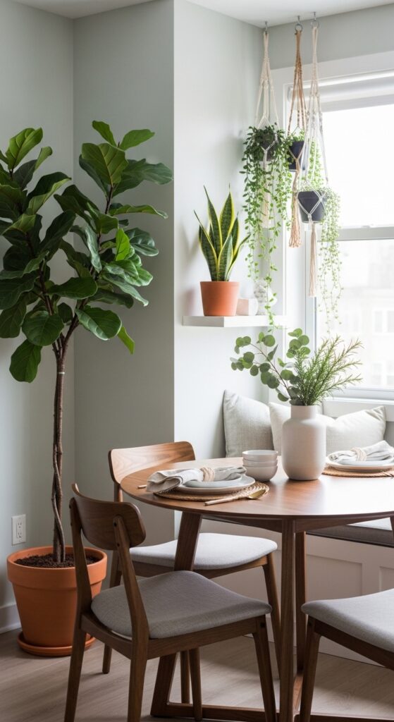 Plants instantly bring life and color into any dining area. A vase of fresh flowers or small potted herbs on the table can elevate your decor effortlessly. Hanging plants or tall greenery nearby add a natural balance to modern furnishings. Green elements make mealtimes feel fresher and more calming.