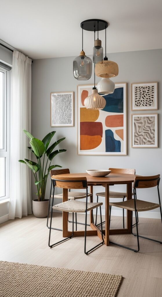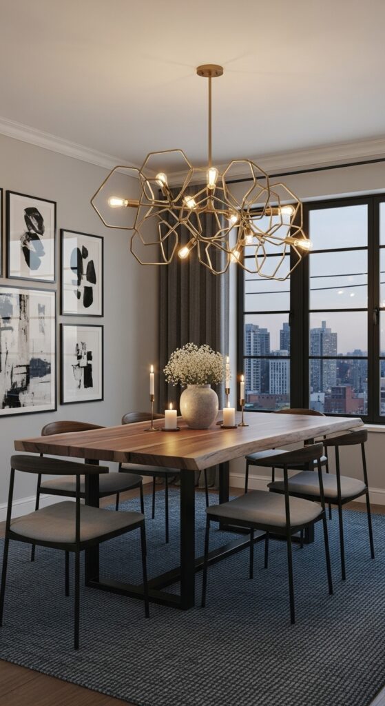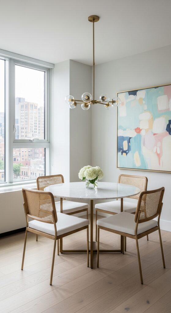 A pendant light or chandelier can define your dining area beautifully. Even in an open-plan apartment, good lighting helps anchor the dining space and adds character. Choose a light fixture that complements your overall decor style — rattan for boho, brass for modern luxe, or matte black for industrial chic. Proper lighting sets the mood for every meal.
