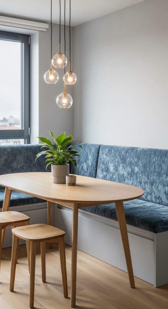 Banquette seating adds both comfort and sophistication to apartment dining areas. Built-in benches can maximize corner space while providing hidden storage underneath. Add plush cushions and a few decorative pillows to soften the look. This setup not only saves space but also gives your dining nook a cozy café-inspired charm.