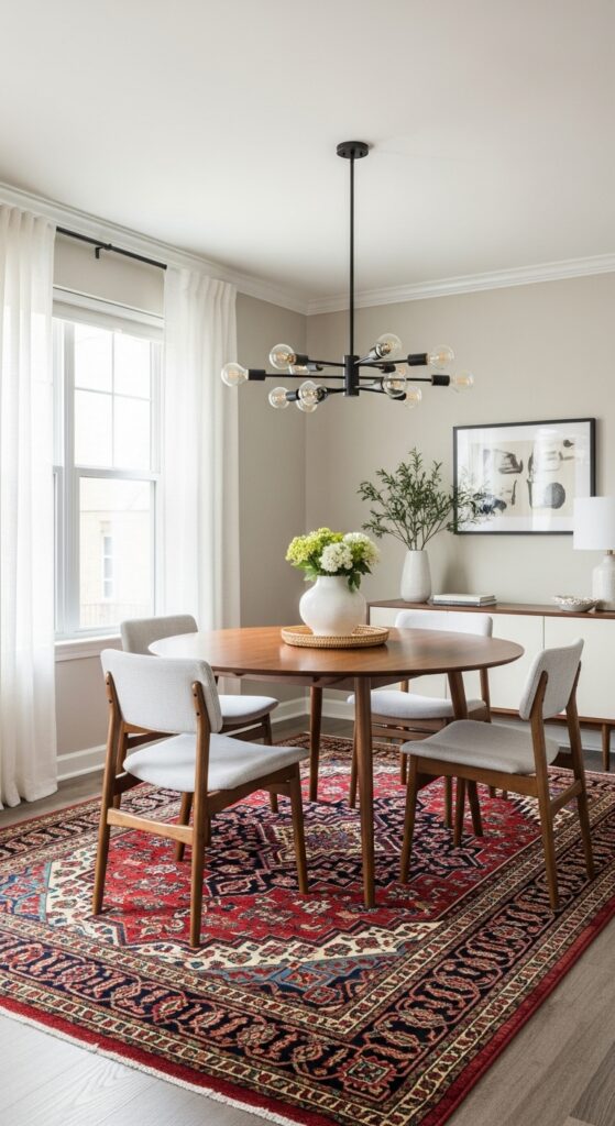 Rugs visually separate the dining area from the rest of your apartment, especially in open layouts. Choose a rug large enough for chairs to move comfortably without catching edges. Go for patterns that add depth and color without overwhelming the space. A well-chosen rug makes the dining area feel intentional and stylish.