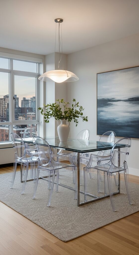 If you’re working with a very small apartment, transparent furniture like acrylic or glass tables and chairs can make the space feel open and light. These materials don’t visually block the room, giving an airy, modern feel. Combine them with metallic accents or neutral tones for a sleek, elegant finish.
