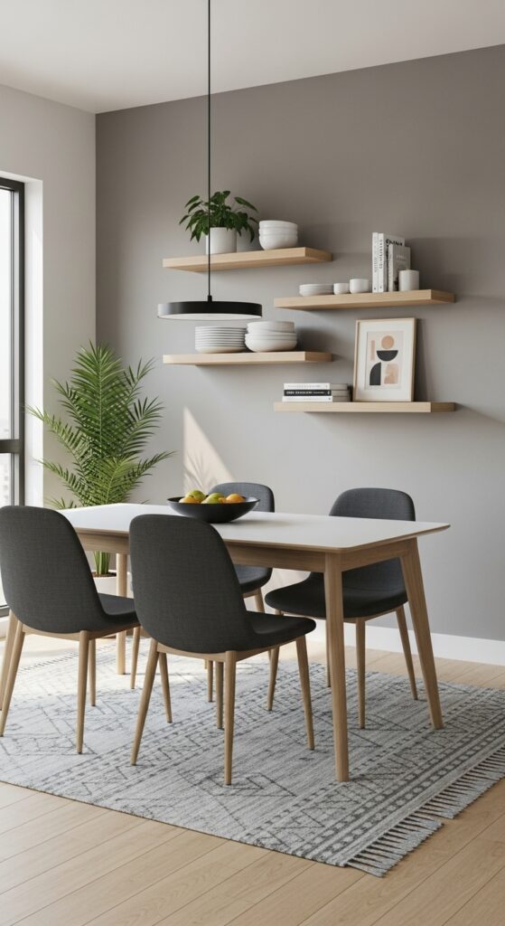 Floating shelves near your dining area are a smart way to add storage and style. You can display glassware, small plants, or framed photos to make the space feel personal. It’s a clever alternative to bulky cabinets, keeping your apartment open and organized. Floating shelves also act as a mini bar or serving station during gatherings.