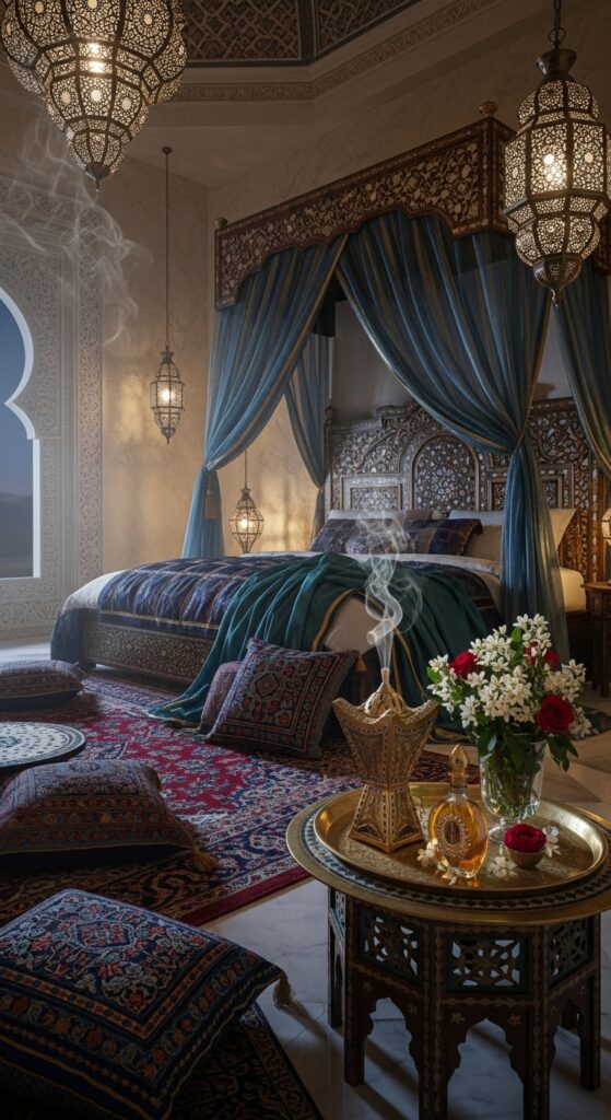 The sensory experience is essential in Arabian design. Use scented candles, oud diffusers, or incense to fill your bedroom with warm, exotic aromas. Scents like sandalwood, amber, and musk create a calming, luxurious mood. Combine the fragrance with soft lighting and rich textures, and your Arabian bedroom will feel like a true royal sanctuary.