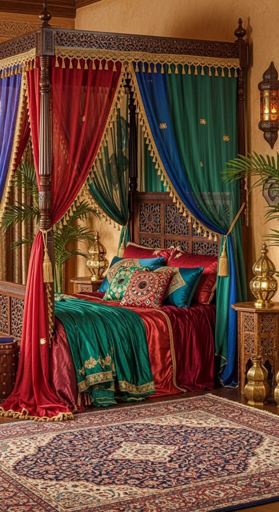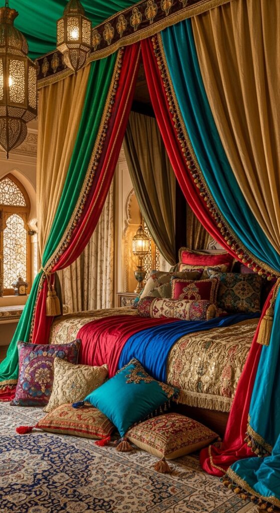 Nothing says Arabian luxury quite like a dreamy canopy bed. Drape sheer fabrics or richly colored curtains from the ceiling or a four-poster frame to create a romantic, tent-like effect. It brings softness and grandeur to your space while maintaining a cozy, intimate vibe. Add string lights or fairy lights to enhance the magical feel at night.