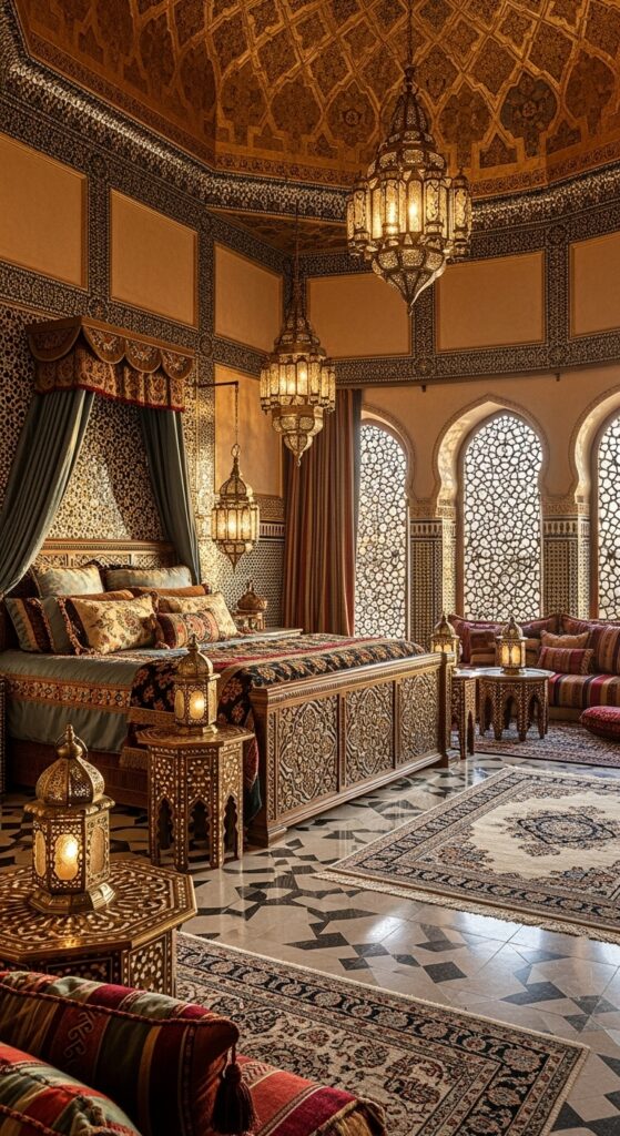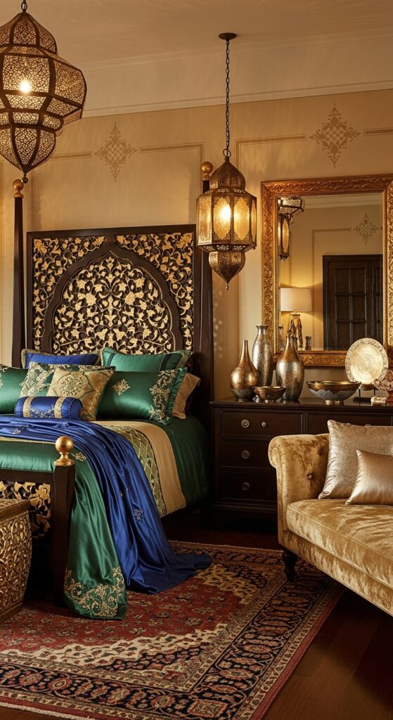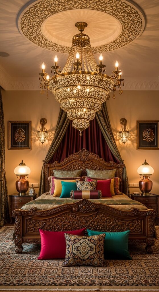 Lighting plays a dramatic role in Arabian bedrooms. Choose lantern-style pendants, brass chandeliers, or intricately cut metal lamps that cast mesmerizing patterns on your walls. Warm-toned bulbs add to the cozy, golden glow typical of Middle Eastern interiors. Place smaller lamps on bedside tables to enhance the romantic and intimate atmosphere.