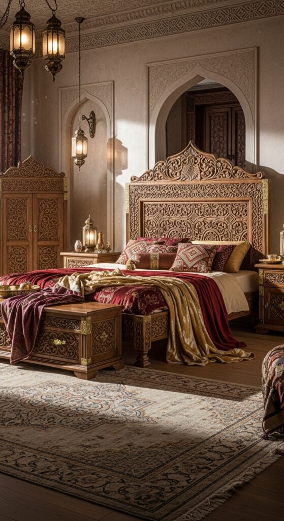 Arabian decor often features handcrafted wooden furniture with intricate carvings. Opt for dark wood headboards, side tables, and dressers with traditional detailing. These elements add depth, texture, and a sense of heritage to your room. If you prefer a modern twist, balance ornate wooden pieces with minimalist decor to keep the space light and elegant.
