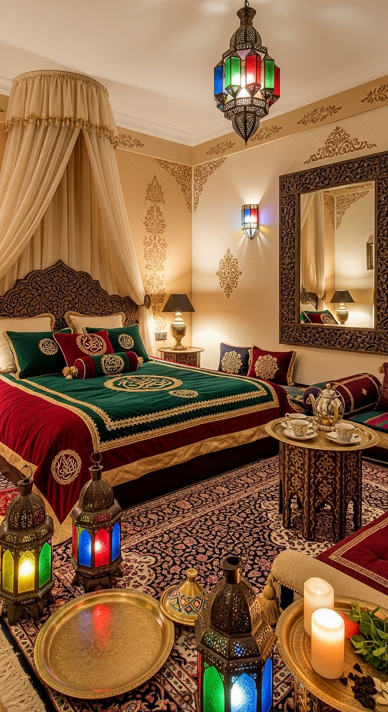 Complete your Arabian bedroom with authentic decorative pieces. Think metal trays, ornate mirrors, lanterns, or Arabic calligraphy wall art. These accessories add depth and storytelling to your decor. Mixing traditional art with modern touches keeps your space sophisticated while celebrating Middle Eastern heritage and craftsmanship.